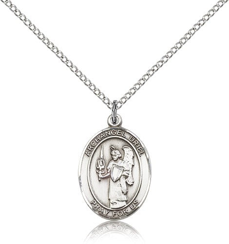 This St. Uriel Pendant is made of sterling silver and is approximately the size of a nickel. The jewelry pendant is paired with an 18 inch sterling silver light curb chain as pictured. All medals are gift boxed in a beautiful blue velvet hinged jewelry gift box.