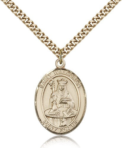 St. Walburga Medal This St. Walburga Pendant is made of gold filled and is approximately the size of a quarter. The jewelry pendant is paired with a 24 inch gold filled heavy curb chain as pictured. All medals are gift boxed in a beautiful blue velvet hinged jewelry gift box.