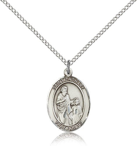 St. Zachary Medal This St. Zachary Pendant is made of sterling silver and is approximately the size of a nickel. The jewelry pendant is paired with an 18 inch sterling silver light curb chain as pictured. All medals are gift boxed in a beautiful blue velvet hinged jewelry gift box.