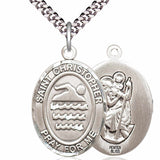 An oval shaped pendant with an image of St. Christopher one one side and a Swimmer on the reverse side. There is a selection of chains to choose from.