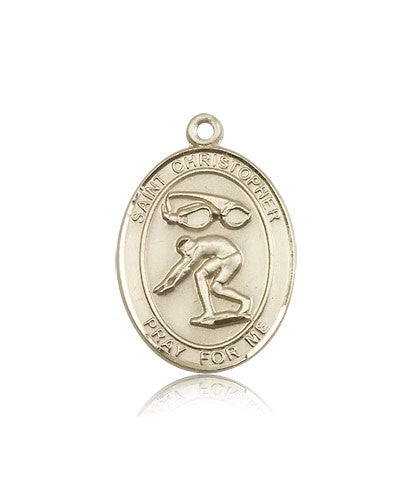 St. Christopher Swimming Medal This St. Christopher Swimming Pendant is made of 14 Karat Gold and is approximately the size of a quarter. The jewelry pendant is sold individually and does not come with a chain. All medals are gift boxed in a beautiful blue velvet hinged jewelry gift box.