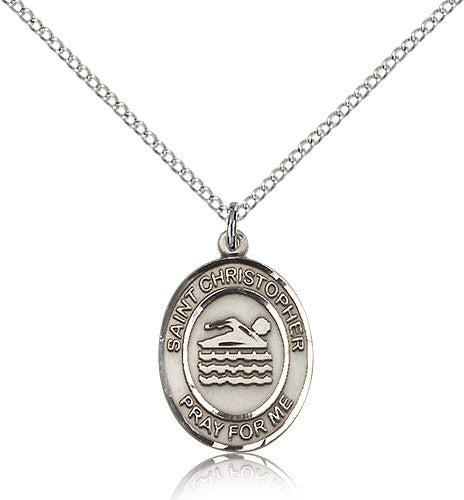 St. Christopher Swimming Medal This St. Christopher Swimming Pendant is made of sterling silver and is approximately the size of a nickel. The jewelry pendant is paired with an 18 inch sterling silver light curb chain as pictured. All medals are gift boxed in a beautiful blue velvet hinged jewelry gift box.