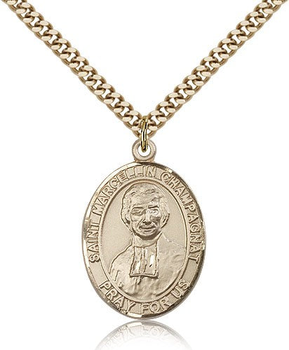 St. Marcellin Champagnat Medal This St. Marcellin Champagnat Pendant is made of gold filled and is approximately the size of a quarter. The jewelry pendant is paired with a 24 inch gold filled heavy curb chain as pictured. All medals are gift boxed in a beautiful blue velvet hinged jewelry gift box.