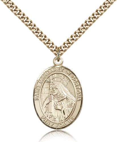 This St. Margaret of Cortona Pendant is made of gold filled and is approximately the size of a quarter. The jewelry pendant is paired with a 24 inch gold filled heavy curb chain as pictured. All medals are gift boxed in a beautiful blue velvet hinged jewelry gift box.