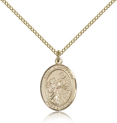This St. Nimatullah Pendant is made of gold filled and is approximately the size of a nickel. The jewelry pendant is paired with an 18 inch gold filled light curb chain as pictured. All medals are gift boxed in a beautiful blue velvet hinged jewelry gift box.