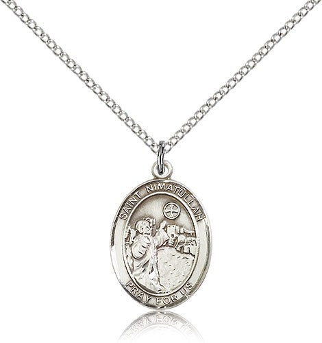 This St. Nimatullah Pendant is made of sterling silver and is approximately the size of a nickel. The jewelry pendant is paired with an 18 inch sterling silver light curb chain as pictured. All medals are gift boxed in a beautiful blue velvet hinged jewelry gift box.
