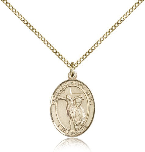 St. Paul of the Cross Medal This St. Paul of the Cross Pendant is made of gold filled and is approximately the size of a nickel. The jewelry pendant is paired with an 18 inch gold filled light curb chain as pictured. All medals are gift boxed in a beautiful blue velvet hinged jewelry gift box.