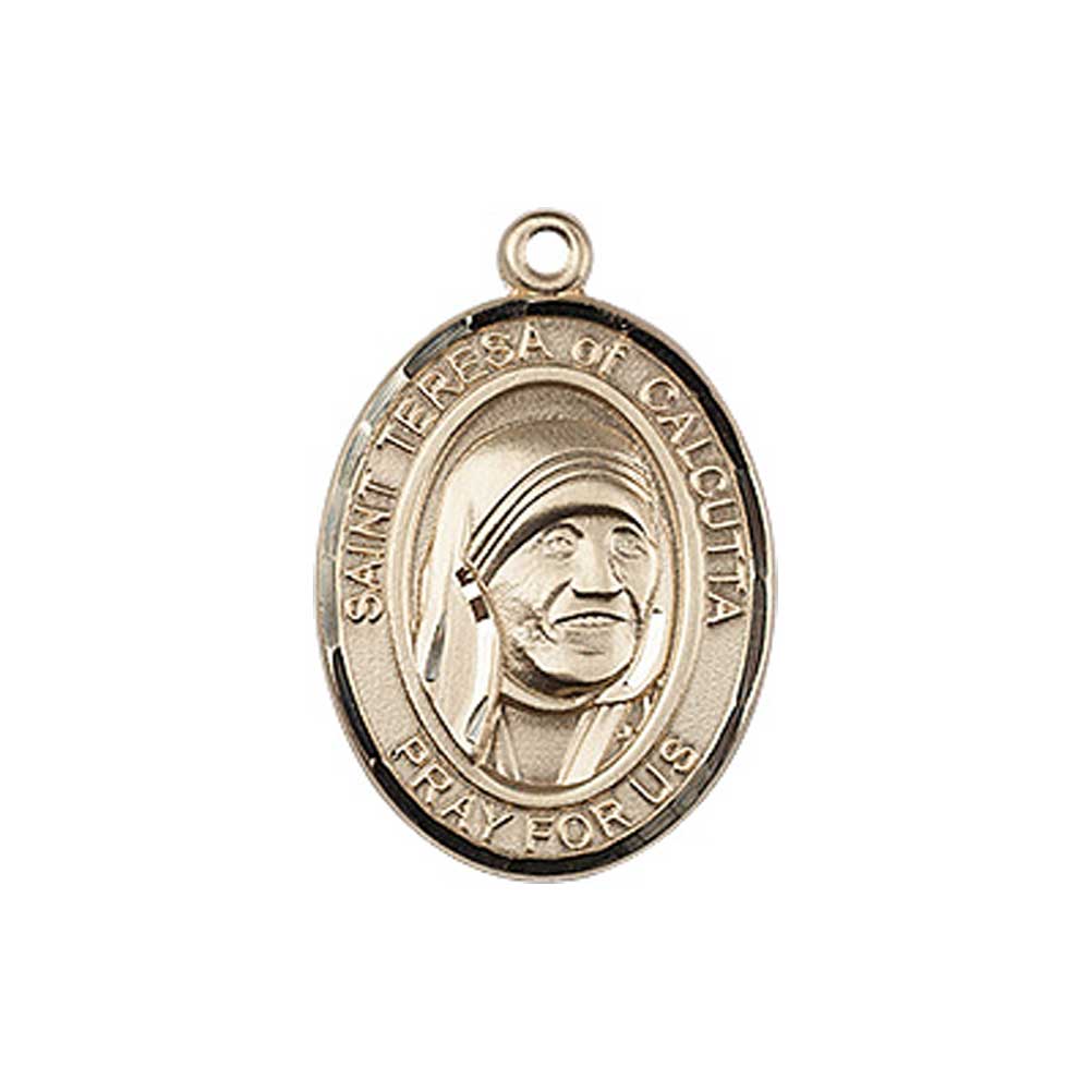St. Teresa of Calcutta Medal This St. Teresa of Calcutta Pendant is made of 14 Karat Gold and is approximately the size of a nickel. The jewelry pendant is sold individually and does not come with a chain. All medals are gift boxed in a beautiful blue velvet hinged jewelry gift box.