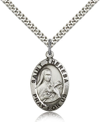 This St. Theresa Medal is paired with a 24 inch stainless steel heavy curb chain as pictured. All medals are gift boxed in a light blue velvet jewelry box ready for gift giving.
