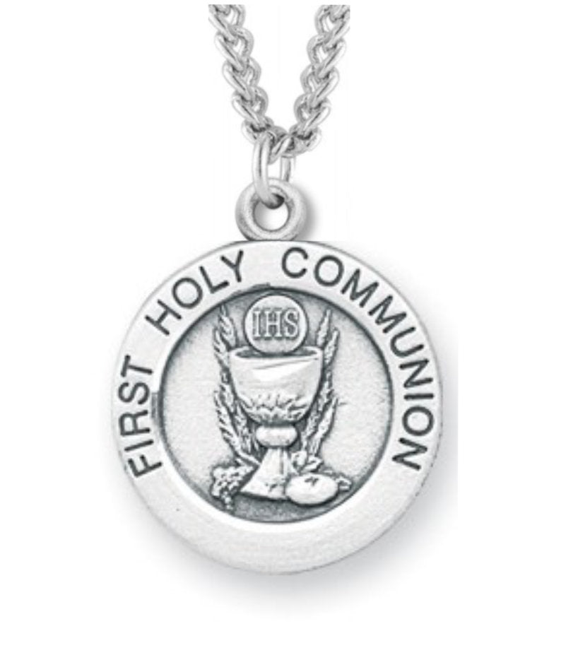 This round Communion Pendant features a wide border with "First Holy Communion" etched in dark letters. A chalice forms the center focal point of the commemorative necklace.